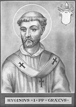 Św. Hygin to 9. z kolei papież. Był Grekiem pochodzącym z Aten, zanim został biskupem Rzymu, był filozofem. Papieżem został w roku 136; inne źródła podają rok 138 lub 140. Długość jego pontyfikatu według różnych źródeł wynosiła 4 lub 12 lat.