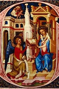 W szóstym miesiącu posłał Bóg anioła Gabriela do miasta w Galilei, zwanego Nazaret, do dziewicy Maryi, która była poślubiona Józefowi z rodu Dawida. „Anioł wszedł do Niej i rzekł: »Bądź pozdrowiona, pełna łaski, Pan z Tobą, <błogosławiona jesteś między niewiastami>«” (Łk 1, 28). Ona zmieszała się i rozważała, co mają znaczyć te słowa, ale anioł powiedział, żeby się nie bała, znalazła bowiem łaskę u Boga. Ma oto począć i porodzić Syna, któremu da imię Jezus. „(…) Będzie On wielki i będzie nazwany Synem Najwyższego, a Pan Bóg da Mu tron Jego praojca Dawida. Będzie panować nad domem Jakuba na wieki, a Jego panowaniu nie będzie końca.” (Łk 1, 3233). Maryja zdziwiła się, jak to się może stać, skoro nie zna męża. Anioł powiedział Jej, że Duch Święty zstąpi na Nią, a Święte, które się narodzi, będzie nazwane Synem Bożym. Powiedział też Maryi, że jej krewna, Elżbieta, też spodziewa się dziecka i jest już w szóstym miesiącu. Dla Boga bowiem nie ma nic niemożliwego. „Na to rzekła Maryja: »Oto ja służebnica Pańska, niech mi się stanie według twego słowa!«” (Łk 1, 38).