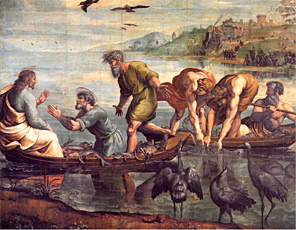 Gdy już przestał mówić, polecił Szymonowi, żeby wypłynął na głębię i zarzucił sieci. Szymon odpowiedział, że całą noc łowili i nic nie złowili. Ale na słowo Jezusa zarzuci sieci. Skoro tak uczynił, zgarnęli takie mnóstwo ryb, że sieci zaczęły się rwać. Podpłynęła druga łódź, żeby im pomóc, ale ryby tak napełniły obie łodzie, że się prawie zanurzały. „Widząc to Szymon Piotr przypadł Jezusowi do kolan i rzekł: »Odejdź ode mnie, Panie, bo jestem człowiek grzeszny«. I jego bowiem, i wszystkich jego towarzyszy w zdumienie wprawił połów ryb, jakiego dokonali; jak również Jakuba i Jana, synów Zebedeusza, którzy byli wspólnikami Szymona. Lecz Jezus rzekł do Szymona: »Nie bój się, odtąd ludzi będziesz łowił«. I przyciągnąwszy łodzie do brzegu, zostawili wszystko i poszli za Nim.” (Łk 5, 811).