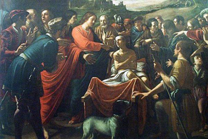 Gdy Jezus powrócił, przyszedł do Niego człowiek imieniem Jair, który był przełożonym synagogi. Upadł Mu do nóg i prosił, żeby zaszedł do jego domu, miał bowiem dwunastoletnią córkę jedynaczkę, która była bliska śmierci. Gdy Jezus tam szedł, tłumy napierały na niego. Była też pewna kobieta, cierpiąca od dwunastu lat na upływ krwi. Podeszła od tyłu i dotknęła frędzli Jego płaszcza i natychmiast ustał jej upływ krwi. Jezus poznał, że ktoś Go dotknął, bo moc wyszła od Niego. Kobieta opowiedziała wobec całego ludu, co się stało, a Jezus powiedział do niej, że wiara jej ocaliła ją; niech idzie w pokoju.