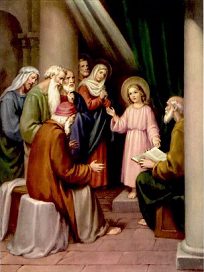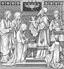 Gdy nadszedł dzień ósmy i należało obrzezać Dziecię, nadano Mu imię Jezus, jak powiedział anioł. Gdy potem minęły dni oczyszczenia według Prawa Mojżeszowego, zanieśli Dziecko do Jerozolimy, aby przedstawić Je Panu. Mieli również złożyć w ofierze parę synogarlic albo dwa młode gołębie, zgodnie z przepisem Prawa Pańskiego. A żył w Jerozolimie sprawiedliwy i pobożny człowiek imieniem Symeon. Jemu Duch Święty objawił, że nie umrze, aż zobaczy Mesjasza Pańskiego. Za natchnieniem więc Ducha przyszedł do świątyni. Kiedy rodzice wnosili Dzieciątko Jezus, on „…wziął Je w objęcia, błogosławił Boga i mówił: »Teraz, o Władco, pozwól odejść słudze Twemu w pokoju, według Twojego słowa. Bo moje oczy ujrzały Twoje zbawienie, któreś przygotował wobec wszystkich narodów: światło na oświecenie pogan i chwałę ludu Twego, Izraela.«” (Łk 2, 2832). Józef i Maryja dziwili się temu, Symeon zaś powiedział do Maryi, że Jezus przeznaczony jest na upadek i powstanie wielu w Izraelu „…i na znak, któremu sprzeciwiać się będą. A Twoją duszę miecz przeniknie, aby na jaw wyszły zamysły serc wielu.” (Łk 2, 3435).