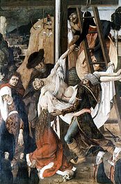 Pod wieczór przyszedł Józef z Arymatei, zamożny człowiek, który też był uczniem Jezusa i poprosił Piłata o wydanie mu ciała Jezusa. Owinął je w czyste płótno i złożył w swoim nowym grobie. Przed wejściem zatoczył duży kamień i odszedł. A Maria Magdalena i druga Maria zostały tam.