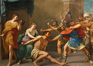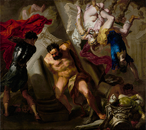 Tymczasem włosy poczęły Samsonowi odrastać. Filistyni świętowali z powodu pojmania Samsona i cały lud cieszył się z tego. Kiedy tak się bawili, władcy filistyńscy nakazali przywołać Samsona, żeby ich zabawiał. Przyprowadzono go więc z więzienia i zabawiał ich. Potem postawiono go między dwoma kolumnami. Samson rzekł do chłopca, który go trzymał za rękę, żeby pozwolił mu oprzeć się o kolumny, na których stoi dom. W domu tym byli wszyscy władcy filistyńscy, a na dachu około trzech tysięcy mężczyzn i kobiet. Wtedy Samson wezwał Pana, aby przywrócił mu siły, chociaż na ten jeden raz, żeby mógł pomścić na Filistynach swoje oczy. Ujął potem obie kolumny, a gdy się na nich mocno oparł, runął cały dom na władców i na cały lud, który był w nim zebrany. Tych, których zabił, ginąc razem z nimi, było więcej, niż zabił podczas całego swojego życia.