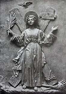 Atrybutami św. Eulalii są krzyż, pal i gołębica.