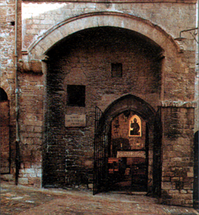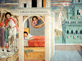 W kilka dni później, kiedy przechodził obok kościoła San Damiano, coś go natchnęło, by wstąpić tam na modlitwę. Wszedł i zaczął żarliwie modlić się przed obrazem Ukrzyżowanego.