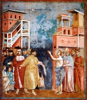 Kiedy więc w marcu albo kwietniu 1206 roku Pietro zaprowadził syna przed biskupa Asyżu, Gruida II i urzędowo go wydziedziczył, Franciszek zdjął z siebie całe odzienie i oddał ojcu ze słowami: „Do tej pory na Ziemi zwałem ciebie ojcem, od teraz będę mógł powiedzieć całkowitą prawdę: Ojcze nasz, który jesteś w Niebie i w którym pokładam wszelkie dobra i zaufanie”. Biskup szybko zakrył go swoim płaszczem, żeby nie budzić zgorszenia, jako że cała scena rozegrała się w bocznej nawie kościoła San Damiano. Od tej chwili Franciszek nie szukał żadnego kontaktu z ojcem, cały swój czas i całe swoje życie postanowił poświęcić zadaniu wyznaczonemu mu przez Boga.