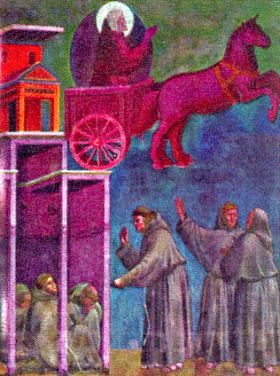 „Widział mężczyznę przybitego do krzyża, który stanął przed nim jakoby serafin z sześcioma skrzydłami, mając rozpostarte ręce i złączone stopy. Dwa skrzydła unosiły się nad głową, dwa były rozwinięte do lotu, a dwa pokrywały całe ciało.