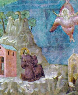 W lecie 1224 roku św. Franciszek udał się na górę La Verna (Alwernia), aby odbyć 40–dniowy post ku czci św. Michała Archanioła. Podczas tego postu, 14 września, w uroczystość Podwyższenia Krzyża świętego, modlił się do Boga o bezpośredni znak. Tak jak kiedyś, otworzył trzykrotnie Biblię i za każdym razem przeczytał opis męki Chrystusa. Zrozumiał, że jego misją ma być cierpienie. Tego samego dnia miał widzenie: