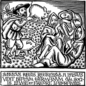 Pewnego razu German bawiąc w gościnie ujrzał, że po uczcie ponownie zastawia się stół. Zdziwiony tym zapytał, dla kogo jeszcze przygotowują posiłek, na co otrzymał odpowiedź, że to dla owych dobrych niewiast, które przychodzą w nocy. German postanowił czuwać, i oto w nocy ujrzał wiele diabłów, które schodziły się do stołu przybrawszy postacie mężczyzn i kobiet. Wówczas polecił im, aby nie odchodziły, i zapytał gospodarzy, czy znają tych ludzi. Kiedy mu powiedziano, że to są sąsiedzi i sąsiadki, posłał do ich domów, a diabłom przykazał, aby pozostały na miejscu. I oto wszystkich sąsiadów znaleziono śpiących w łóżkach, a gdy św. German zaklął diabły, one przyznały się, że w ten sposób udawały ludzi. W tym czasie żył św. Lupus, biskup Troyes. Gdy król Attyla oblegał jego miasto, biskup wszedł na bramę i głośno zapytał, kim jest ten, kto ich napada. Król zaś odrzekł: Ja jestem Attyla, bicz Boży. Na to pokorny sługa Boży odrzekł z westchnieniem: A ja jestem Lupus [wilk], nieszczęsny niszczyciel trzody Bożej, pozbawiony bicza Bożego. I natychmiast rozkazał otworzyć bramy. Bóg jednak zasłonił oczy napastników, tak że przeszedłszy całe miasto od bramy do bramy nie widzieli nikogo i nikomu krzywdy nie zrobili. Otóż z tym to właśnie biskupem Lupusem św. German wyruszył do Brytanii, gdzie krzewiły się wtedy herezje. Podczas ich podróży morskiej wybuchła wielka burza, ale na skutek modlitw św. Germana natychmiast nastała cisza. Lud przyjął ich z wielkim szacunkiem, ponieważ już przedtem diabły, których św. German wypędził z opętanych, zapowiedziały ich przybycie. Oni zaś zwalczywszy herezję powrócili do swego kraju. Pewnego razu, gdy św. German leżał chory w jednej miejscowości, zdarzyło się, że całą tę wieś ogarnął nagły pożar. Proszono go tedy, aby pozwolił się wynieść, i w ten sposób uciekł przed ogniem; on jednak stawił czoło pożarowi i chociaż płomień strawił wszystko naokoło, nie tknął jednak domu, w którym on bawił. Gdy św. German powtórnie jechał do Brytanii, aby tam nawracać heretyków, jeden z jego uczniów, który podążał za nim piechotą, zachorował w Cordoniarum i zmarł. Św. German wracając kazał otworzyć sobie jego grób, zawołał nań po imieniu i spytał, jak mu się wiedzie i czy pragnie w dalszym ciągu z nim pracować. Na to zmarły usiadł i odpowiedział, że jest mu całkiem dobrze i nie chce, aby go przywoływano do życia. Wówczas święty dał mu znak, aby spoczął, a on położywszy głowę ponownie zasnął w Panu. Gdy German nauczał w Brytanii, król tego kraju odmówił gościny jemu i jego towarzyszom. Zdarzyło się zaś, że właśnie pasterz świń królewskich nadszedł z pastwisk niosąc otrzymaną w pałacu żywność do swojej chaty i ujrzał św. Germana z towarzyszami, zmożonych głodem i zimnem. Przyjął ich tedy z dobrocią do swego domu i kazał zabić dla gości jedyne cielę, jakie miał. Po uczcie św. German kazał złożyć na skórze wszystkie kości cielęcia, a gdy pomodlił się nad nimi, cielę natychmiast ożyło. Zaraz następnego dnia św. German udał się do króla i spytał go surowo, dlaczego odmówił mu gościny. Król przestraszył się bardzo i nie wiedział, co ma odpowiedzieć, German zaś rzekł: Odejdź więc i zostaw królestwo lepszemu od ciebie! Następnie z woli Bożej kazał przyjść owemu pasterzowi świń wraz z żoną i ku zdumieniu wszystkich ustanowił go królem. Od tego czasu nad plemieniem Brytyjczyków panują królowie z rodu świniopasa. Gdy Sasi walczyli z Brytyjczykami widzieli, że są w zbyt małej liczbie, przywołali świętych, którzy tamtędy przechodzili, oświeceni zaś przez nich wszyscy ubiegali się o łaskę chrztu. W dzień Wielkanocy tedy zapłonęli takim ogniem wiary, że z wielką odwagą postanowili walczyć odrzuciwszy broń; wróg zaś usłyszawszy o tym zuchwale pospieszył przeciw bezbronnym. Wówczas św. German wraz z towarzyszami potajemnie umówił się z nimi, aby - gdy on zaśpiewa: Alleluja - wszyscy jednym okrzykiem mu odpowiedzieli. Tak się też stało, a kiedy nacierający wrogowie usłyszeli tak wielki krzyk, przerazili się ogromnie i sądząc, że to nie góry, ale samo niebo wali się na ich głowy, wszyscy uciekli. Przechodząc raz przez miasto Autun św. German zatrzymał się przy grobie św. Kasjana i zapytał go, jak mu się powodzi. On zaś natychmiast z grobu odpowiedział, tak że wszyscy słyszeli: Zażywam błogiego odpoczynku i oczekuję przybycia Odkupiciela. German odparł mu na to: Odpoczywaj tedy przez długi czas w Chrystusie i wstawiaj się usilnie za nami, abyśmy wszyscy zasłużyli sobie na wspólną radość świętego zmartwychwstania. Pewnego razu św. German przybył do Rawenny, a tam królowa Placidia oraz jej syn Walentynian przyjęli go z wielką czcią. Gdy nadeszła pora posiłku, królowa posłała Germanowi srebrną misę pełną wyszukanych potraw, on zaś przyjął ją, ale potrawy oddał sługom, a misę samą zatrzymał, aby ją dać biednym. Chcąc jednak odwdzięczyć się królowej, posłał jej drewnianą miseczkę, w której leżał kawałek jęczmiennego chleba. Królowa przyjęła ją chętnie, a następnie kazała ją oprawić w srebro. Pewnego razu owa królowa zaprosiła Germana na ucztę. W dobroci swojej przyjął on zaproszenie, ale ponieważ wśród ciągłych postów i modlitw osłabł, więc pojechał ze swojej gospody aż do pałacu na ośle. Tymczasem podczas gdy on był na uczcie, osioł zdechł. Usłyszawszy o tym królowa ofiarowała biskupowi niezmiernie łagodnego rumaka, on jednak spojrzawszy nań rzekł: Niech mi pokażą mego osła, on mnie tutaj przyniósł, więc chcę, aby mnie odniósł z powrotem! To rzekłszy podszedł do martwego zwierzęcia i rzekł: Wstawaj, stary, wracajmy do naszej gospody - a osioł natychmiast podskoczył, zerwał się i odni